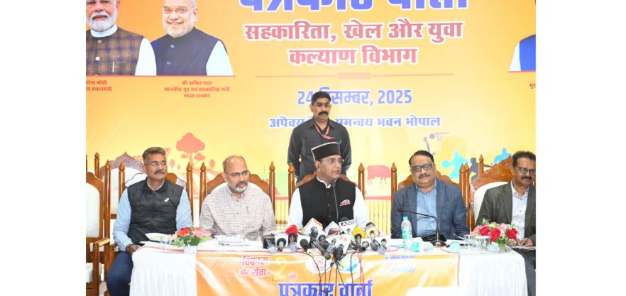 प्रधानमंत्री नरेंद्र मोदी की डबल इंजन सरकार की परिकल्पना—जहां केंद्र और राज्य साझा लक्ष्य, साझा गति और साझा परिणाम के साथ काम करते हैं—आज मध्यप्रदेश में पूरी मजबूती से ज़मीन पर उतरती दिखाई दे रही है। मुख्यमंत्री डॉ. मोहन यादव के सक्षम नेतृत्व में प्रदेश ने बीते दो वर्षों में खेल, युवा कल्याण और सहकारिता के क्षेत्र में अभूतपूर्व उपलब्धियाँ हासिल की हैं। यह बात सहकारिता, खेल एवं युवा कल्याण मंत्री श्री विश्वास कैलाश सारंग ने बुधवार को अपेक्स बैंक समन्वय भवन, भोपाल में आयोजित प्रेसवार्ता में कही।